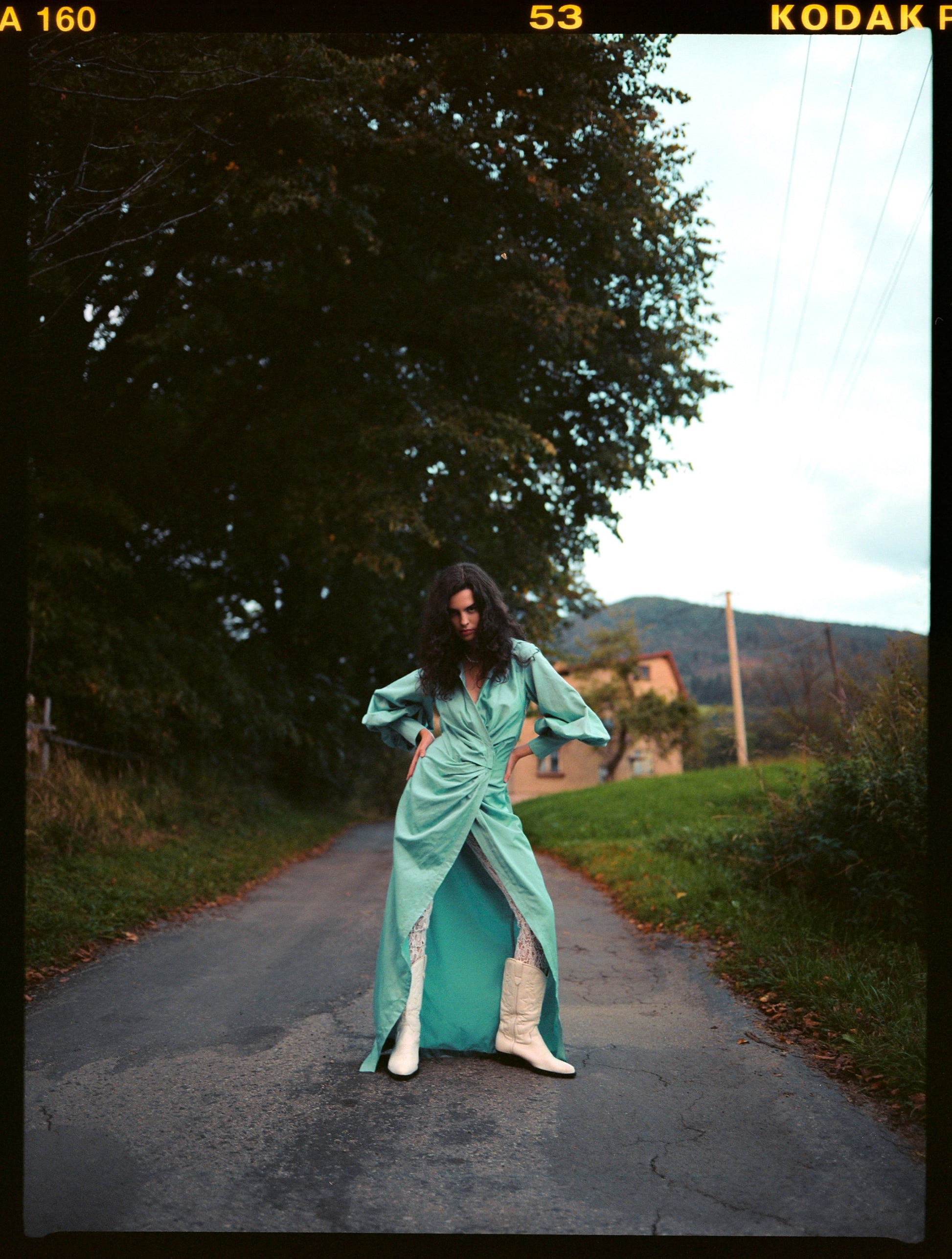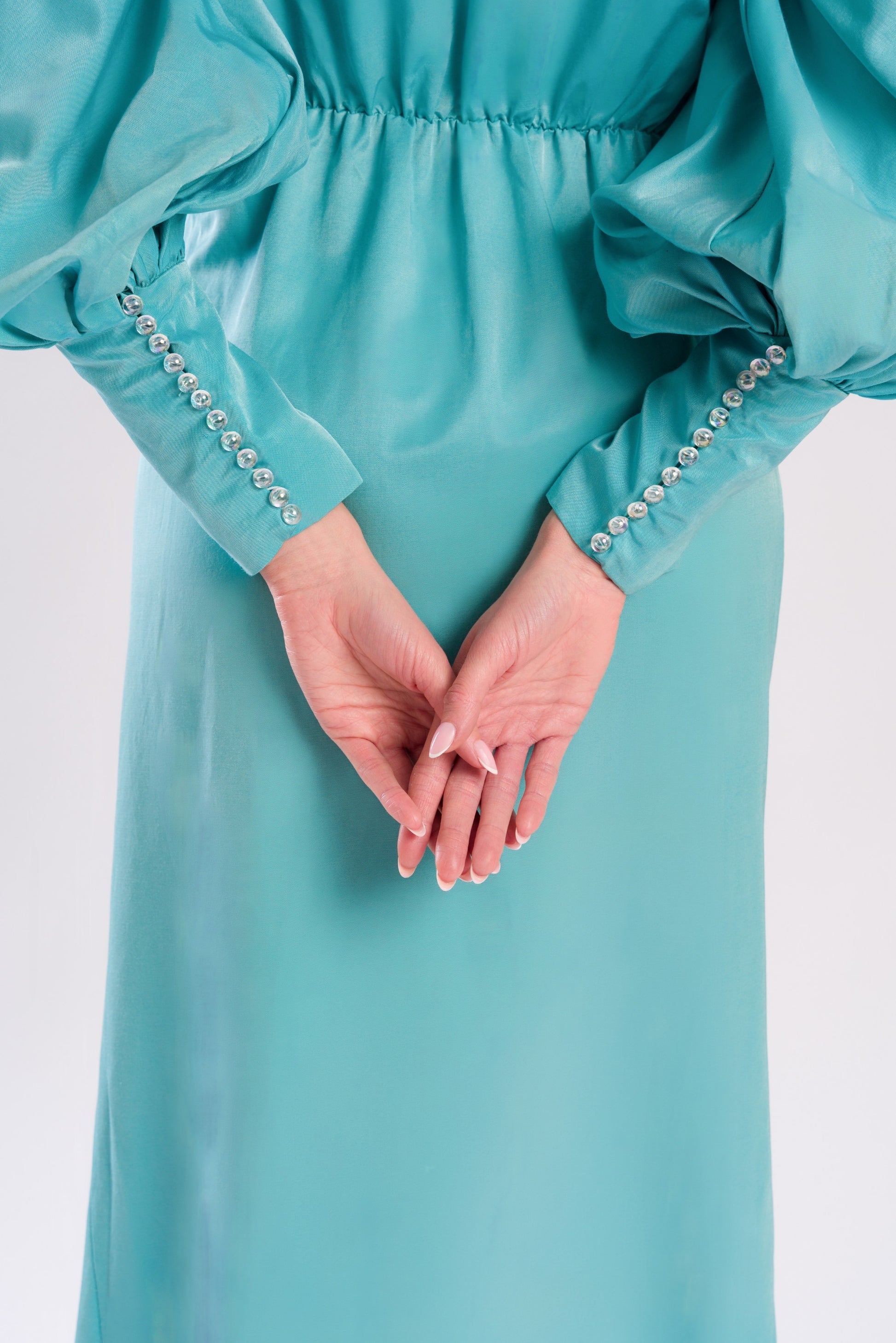 Style: Long-sleeve maxi dress with a twisted front, collar, and buttoned cuffs.