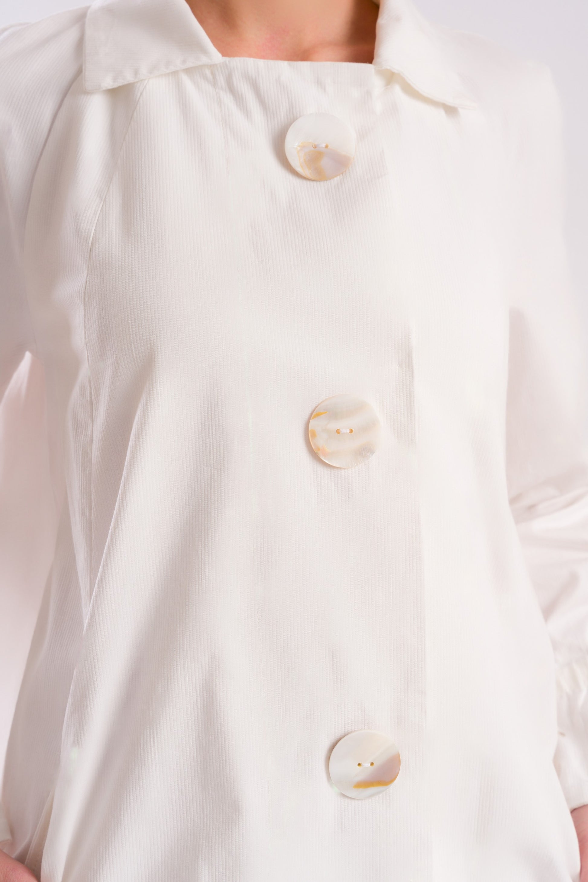 Style: Collared coat with a three-button closure, pockets, and an asymmetrical (high-low) hem.