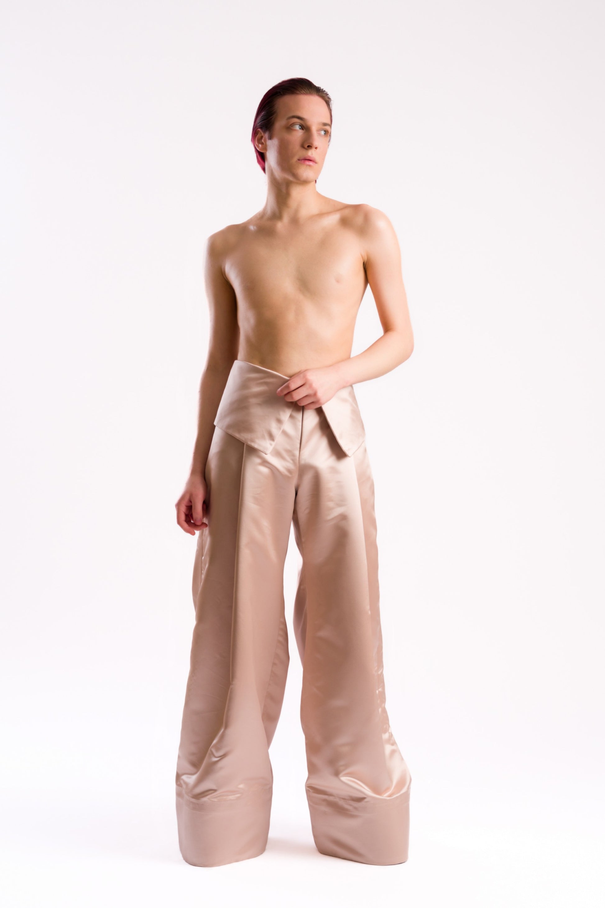 Style: High-waisted, wide-leg culottes/palazzo pants with a folded hem.